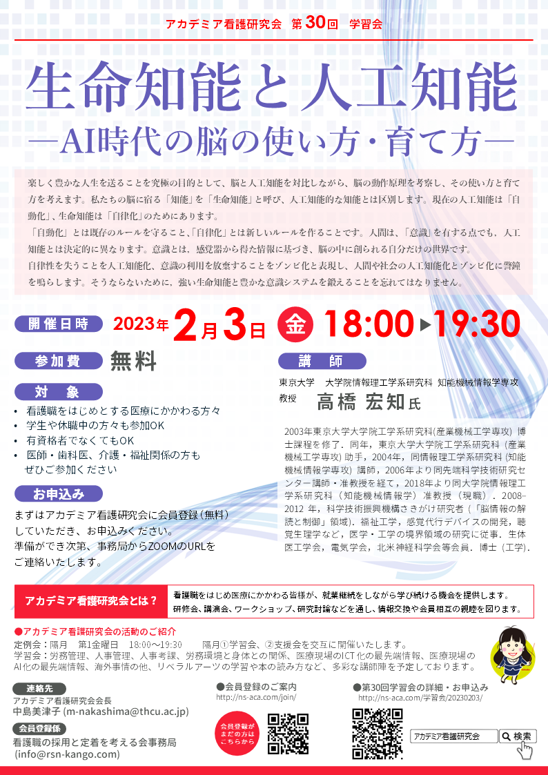 上記、①、②ともに、参加資格:アカデミア看護研究会に登録していただき(無料)、URLにてZOOM参加となります。
