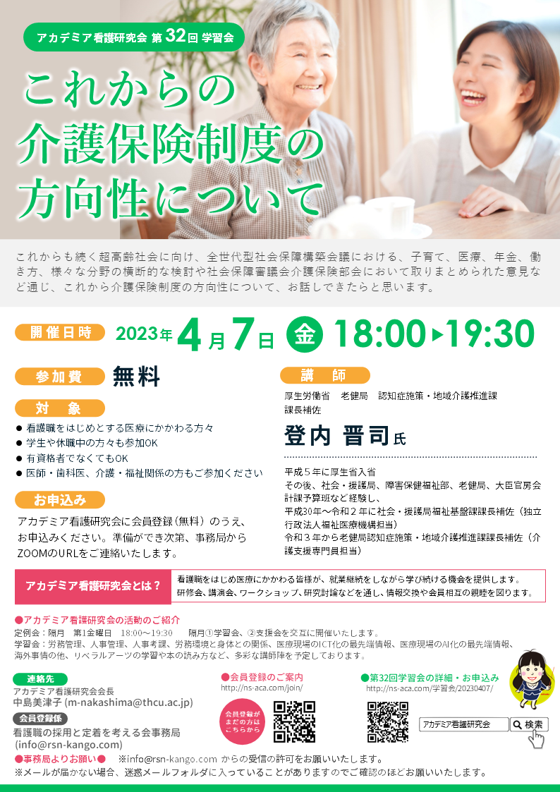 上記、①、②ともに、参加資格:アカデミア看護研究会に登録していただき(無料)、URLにてZOOM参加となります。