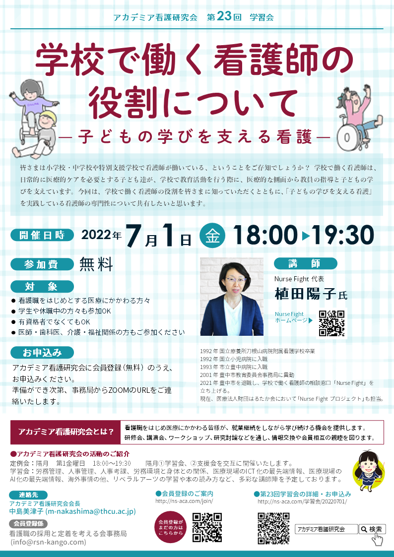 上記、①、②ともに、参加資格:アカデミア看護研究会に登録していただき(無料)、URLにてZOOM参加となります。