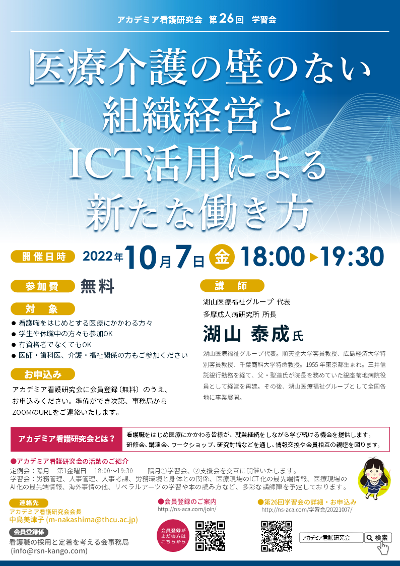上記、①、②ともに、参加資格:アカデミア看護研究会に登録していただき(無料)、URLにてZOOM参加となります。