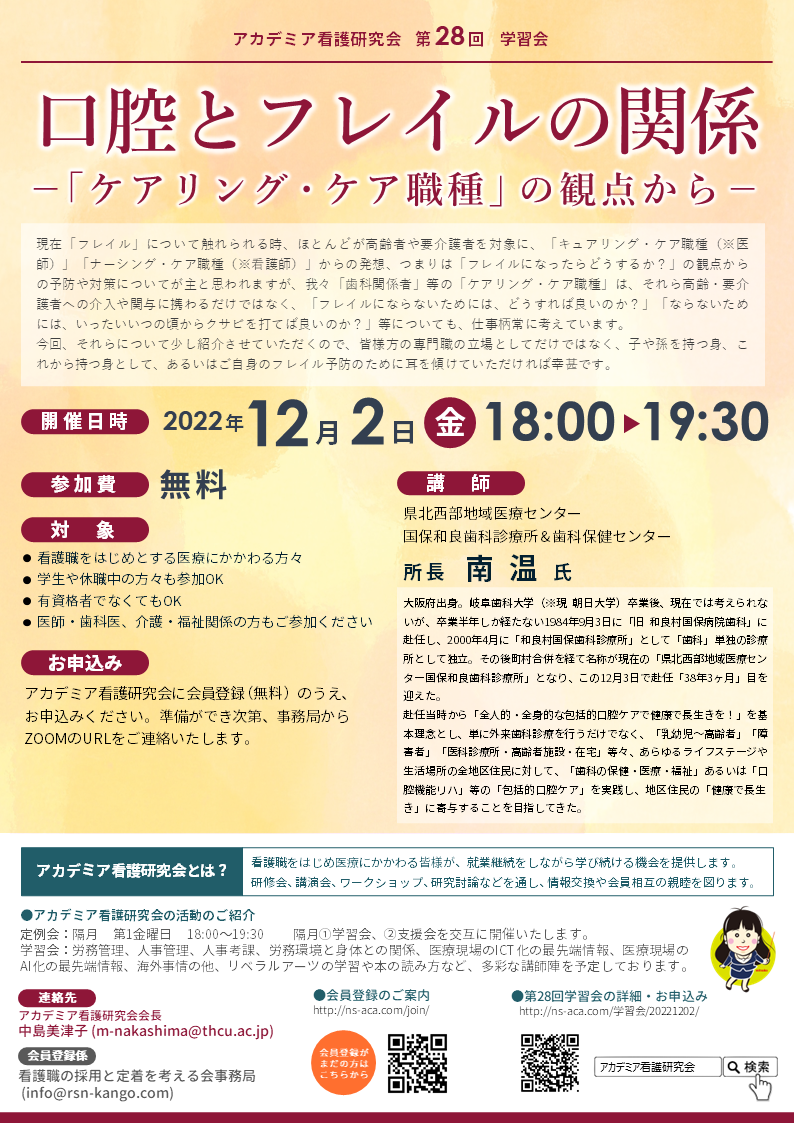上記、①、②ともに、参加資格:アカデミア看護研究会に登録していただき(無料)、URLにてZOOM参加となります。