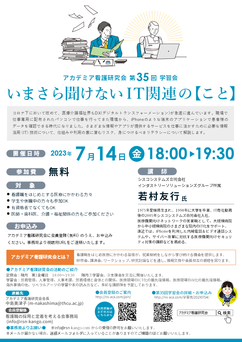 上記、①、②ともに、参加資格:アカデミア看護研究会に登録していただき(無料)、URLにてZOOM参加となります。