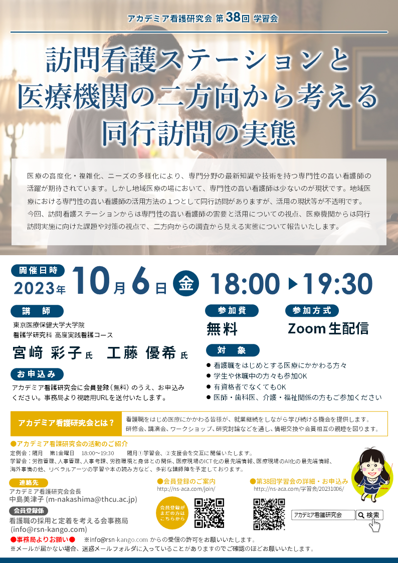 上記、①、②ともに、参加資格:アカデミア看護研究会に登録していただき(無料)、URLにてZOOM参加となります。