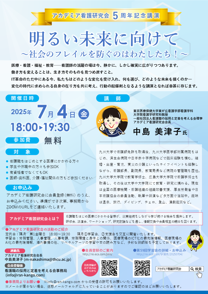 上記、①、②ともに、参加資格:アカデミア看護研究会に登録していただき、URLにてZOOM参加となります。