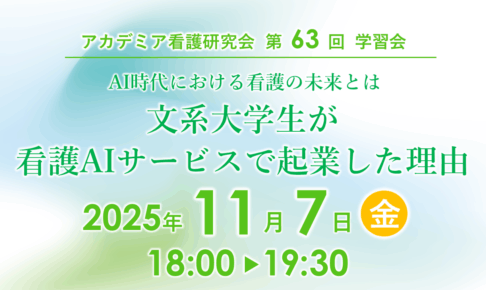 学習会 11/7開催★第63回 AI時代における看護の未来とは~文系大学生が 看護AIサービスで起業した理由~ 2025.11.04 admin 第63回学習会 ◆AI時代における看護の未来とは~文系大学生が 看護AIサービスで起業した理由~ 幸福感の観点(外側)から感じた看護従事者の閉塞感と対峙して気付いた熱量(内側)のギャップについて、医療従事者ではない立場だ…